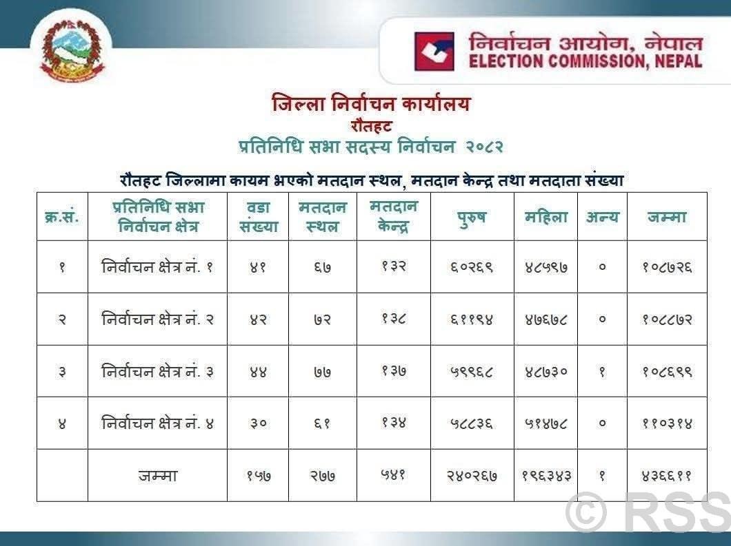 वि.सं. २०७९ के प्रतिनिधि सभाके निर्वाचनमे जिलामे पाँच सओ २३ मतदान केन्द्र छल, तँ अइ साल १८ टा बढ़ौलाक बाद पाँच सओ ४१ टा मतदान केन्द्र कायम भेल जिला निर्वाचन कार्यालय रौतहटके प्रमुख छोटेलाल दास जानकारी देलैन ।